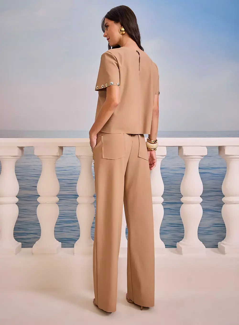 Este conjunto em malha é a expressão do luxo contemporâneo, combinando conforto, sofisticação e design refinado. A blusa possui corte reto e elegante, com aplicação de botões metálicos em prata e dourado nos ombros e mangas, que adicionam brilho e personalidade à peça. A calça, de cintura alta e pernas amplas, apresenta caimento impecável e detalhes que elevam o visual: bolsos traseiros funcionais, fechamento em zíper de metal e acabamento com botões metálicos no bolso lateral, reforçando o toque de exclusividade.